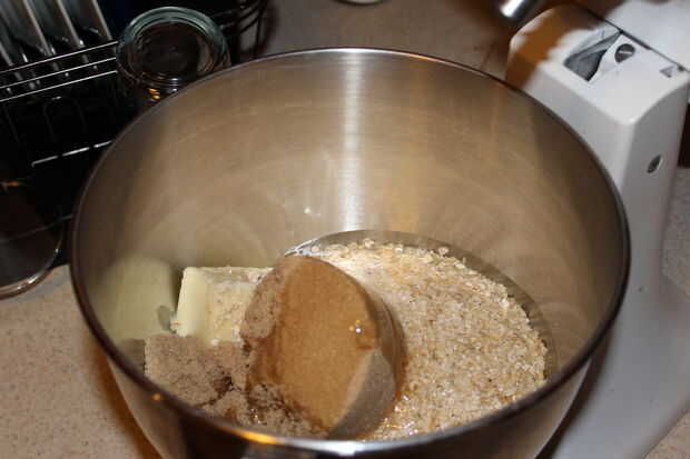 Agregar 4 tazas de avena arrollada cocción rápida al tazón de la batidora de cocina, 1 taza de azúcar a la mezcla bowl, tazón para batir 1 taza margarina blanda y el jarabe de maíz 1/2 taza blanca paquete.