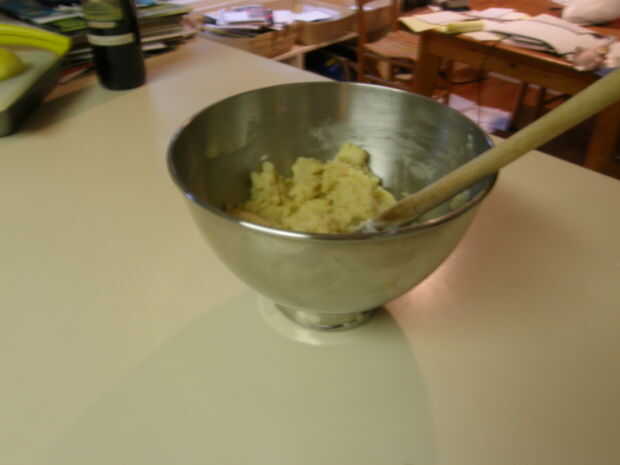 Bueno, en primer lugar, mezclar juntos la mantequilla, 2 tazas de harina y el azúcar en el bol de tamaño mediano.