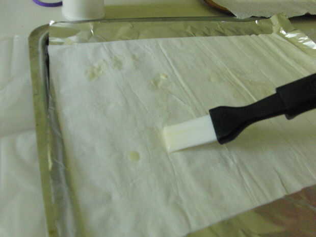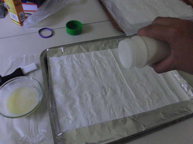 Esto se puede hacer en la bandeja para hornear con el papel. En un recipiente, poner la mantequilla derretida. Toma una hoja de phyllo pasta (tenga cuidado de no rasgarlo y reemplazar definitivamente el papel encerado y papel toalla en la parte superior otra vez) y colóquelo en la bandeja para hornear. Cepille ligeramente con la mantequilla derretida y espolvorear con el azúcar (por mucho que desee-calculo yo uso 1 1/4 cucharadita). Repita este paso con el resto de las piezas de masa. No esparcir la capa superior con azúcar!