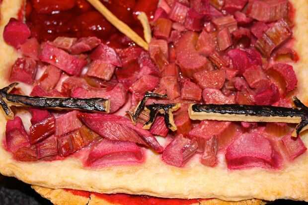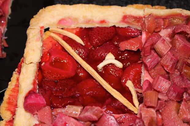 Roll out de una masa de pastel a un cuadrado de 8 pulgadas. Superior de la corteza con el relleno de ruibarbo. Hornee a 375 º f hasta que los bordes estén dorados y ruibarbo es suave, unos 20-30 minutos enfriar completamente antes de ponerlo encima de la tarta de fresas.