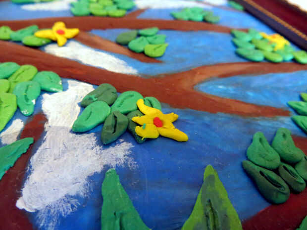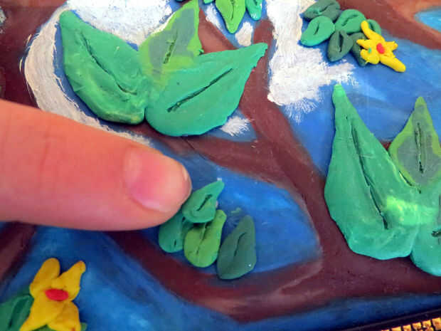 Pequeños detalles pueden ser un gran cambio a la imagen. Hemos añadido algunas hojas y las flores a nuestro árbol que estaban sobre el fondo. Hicimos hojas pellizcando la arcilla verde en las formas de licencia. Puede utilizar su creatividad para agregar lo que quieras hacer tu imagen colorida. Si te hizo un cuadro hermoso y quiere que sea extra especial pone en un marco de imagen, como lo hicimos. Toma tiempo pero al final es increíble!