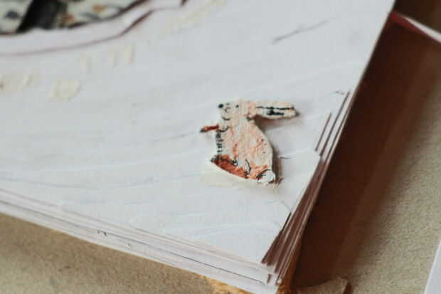 como se puede ver hasta ahora el panorama es realmente "terminado" pero la zona Nevada debajo de la casa todavía está bastante vacía y necesita llenar el espacio, así que... Hice un conejo de nieve: en primer lugar tengo 2 piezas del mismo material que utilicé para la 1ra capa de la casa, y en 1 dibujó un conejo (bastante pequeño si lo pones en comparación) después consiguió el segundo trozo de cartón y remontar la primera imagen en el segundo, luego con unas tijeras de uñas cortado cualquier exceso tarjeta alrededor de las líneas , les pegan y luego lo pegué en el "frente" derecha, abajo, esquina. Mi entonces pintado en un fondo blanco, deja eso seco y ligeramente pintado y dibujó luz marrón alrededor de la cabeza, espalda y pies. luego puse detalles como ojos, patas, bigotes etc..