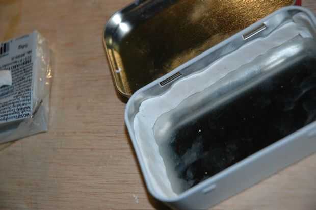 Cubrir el interior de la caja con una capa delgada (alrededor de 3 mm o 1/4") de Fimo. Una vez que has cubierto el interior de la caja con Fimo, dividido en 10 partes iguales utilizando tiras de fimo. Empecé poniendo una franja longitudinal en el centro de la lata, separando el interior en 2 compartimentos largos. Luego, le puse cuatro equidistantes tiras de arcilla para dividir cada mitad-bandeja 5. Hacer lo mismo con la segunda bandeja de media.