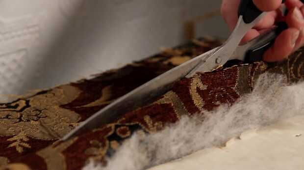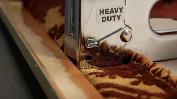 Ir por el interior borde del marco y grapa la tela, bateo y cartón en el marco de imagen.  Asegúrese de tirar la tela enseñaba mientras que la grapa.