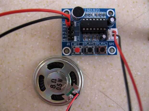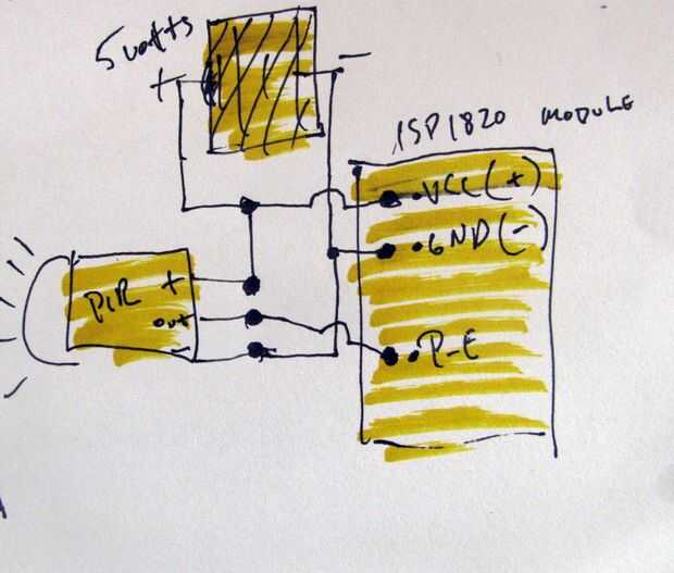 Usando un PIR módulo que tiene el mismo rango de voltaje que la ISD1820 mucho simplificará este proyecto como no tienes que bajar el voltaje de uno de los módulos. Ambos de mis módulos usan rango de 3,5 a 5 voltios.