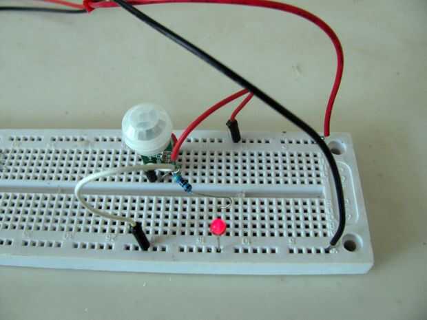 Para probar el PIR por separado sólo tiene que conectar el PIR a la batería sólo tiene que conectar los terminales positivo y negativo. Luego conecte un 400k (100 a 1K es aceptable) resistor de PIR hacia fuera a un LED (positivo) y luego el plomo negativo del LED a tierra. Movimiento frente el PIR encenderá el led.