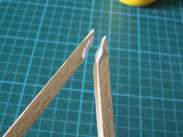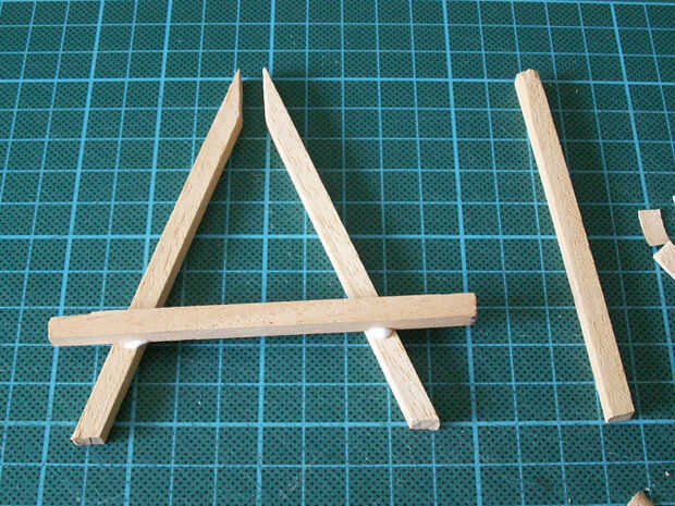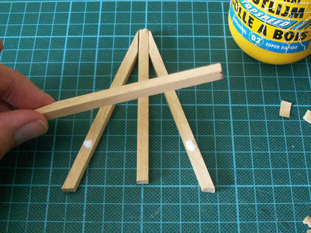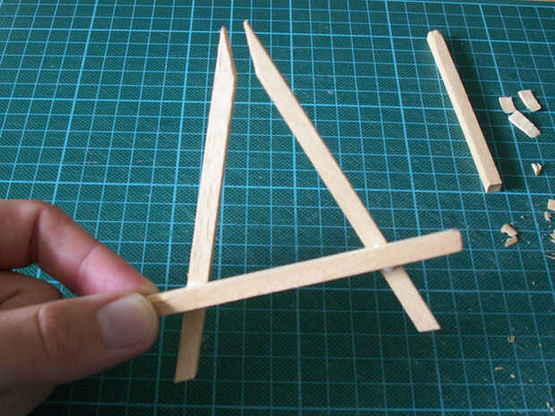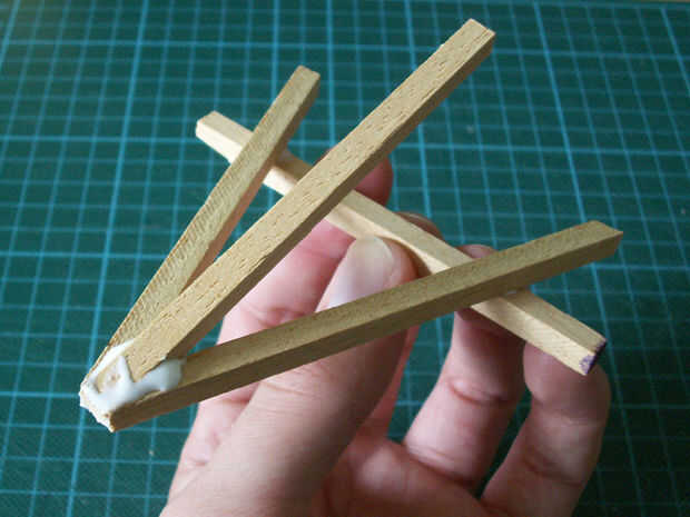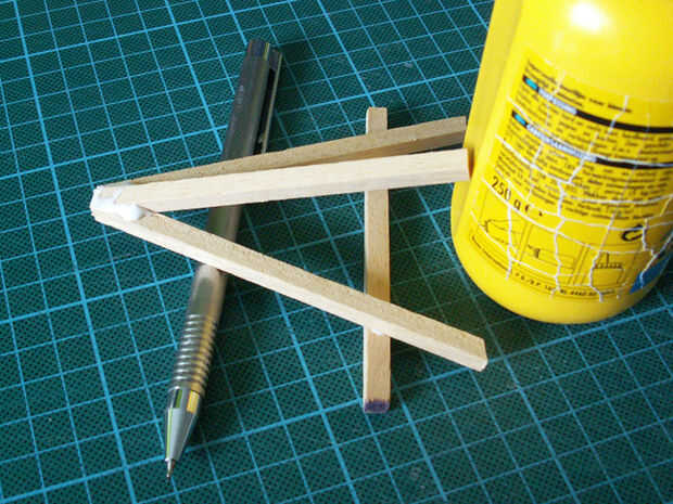 Cuando el pegamento se haya secado, Aplique pegamento entre las 2 barras en la parte superior. Luego apriete en el palo de apoyo bajo un ángulo. Apriete la parte superior más y comprobar si la base del soporte que quieras. Si lo hace, establecer con cierto apoyo y esperar a que el pegamento se seca otra vez.