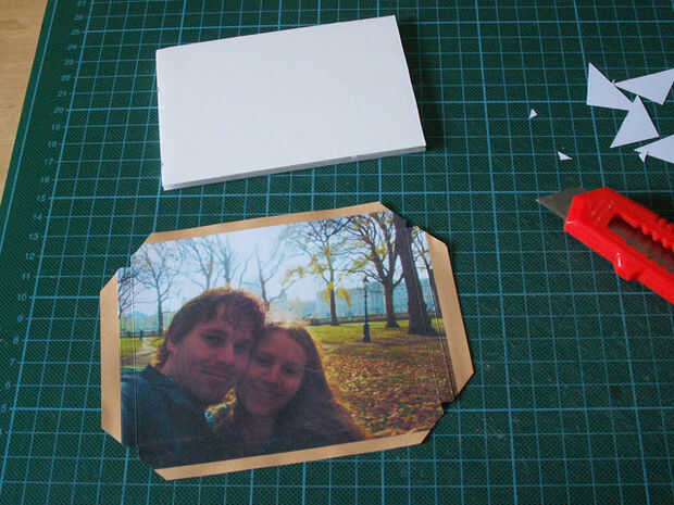 Cortar la imagen con un borde extra de al menos el grueso de la espuma y preferiblemente un poco más. Entonces cortar como en la imagen de abajo, por lo que fácilmente pueden doblar y pegar a tu espuma.