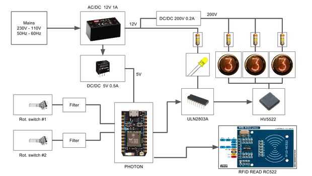 La Junta del fotón debe suministrarse en 5V, para ello, un DC/DC convierte 12V en 5V. Para suministrar el tubo del Nixie, debe generarse tensión DC 200, así que otro DC/DC es encargado de hacer esto. La NFC tag lector se suministra directamente por Pothon Junta en 3, 3V.