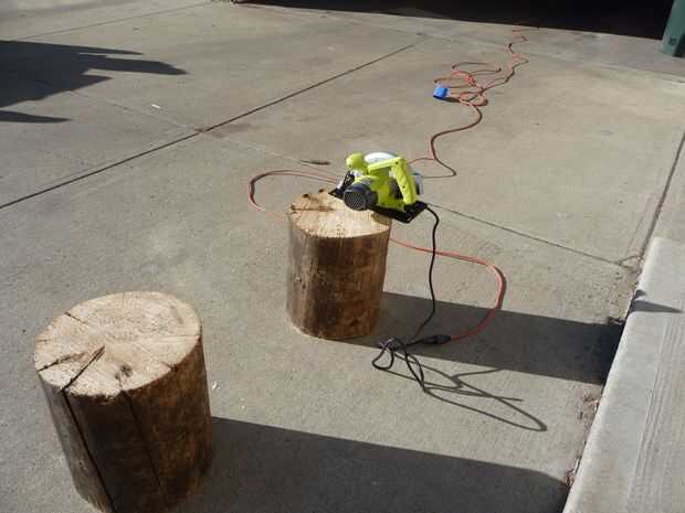 Primero Haz las herramientas necesita (Sierra circular y algo para cortar la madera en) Llevaba gafas de sol como protección para los ojos pero no cualquier otra protección para los ojos.