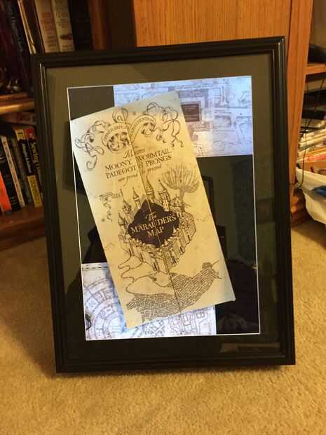 Tenemos una pared dedicada a Harry Potter en nuestra casa (además de las paredes para los personajes de Disney, Star Wars y dragones). Quería mostrar el oficial mapa del Merodeador que obtuvimos de Universal Studios. Sin embargo, quería encontrar una forma correcta de colgar sin que se dañe. Quería también la capacidad de ver el mapa dentro junto con la cubierta en el exterior (proverbial "tener mi pastel y comérselo también.). Por lo tanto, me di cuenta una forma de lograr ambos.