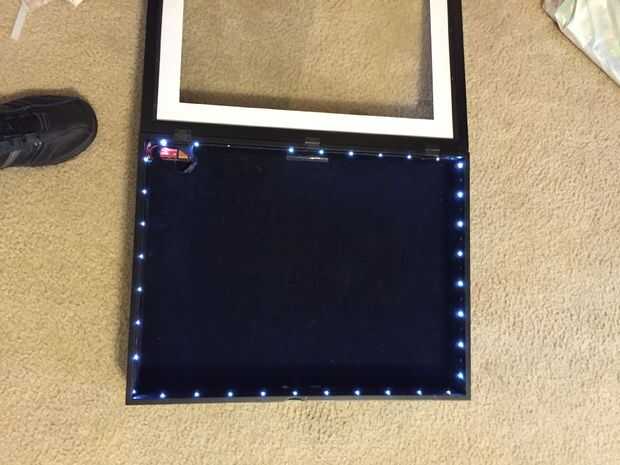 Que suerte hacia fuera y encontré una vitrina a la venta en una tienda local. De lo contrario, hubiera tenido que construir uno. El caso es relativamente simplemente. Es sólo una caja de presentación regular, con una estera en el exterior. Utiliza una batería de 9v a la energía y la tira del LED que va en el interior de la caja. La caja es de aproximadamente 2" de profundidad. El problema con la caja es que el respaldo no es madera, sino de cartón. Esto no hace fácil atar nada. Así que, decidí usar pins e imanes para sostener las secciones del mapa para el respaldo.