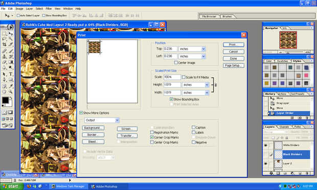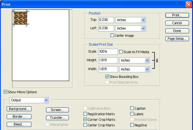 Después de hacer seguro de que (usted decide) que es la capa de separador correcto en la parte superior y visible, vaya a archivo > imprimir con vista previa y asegúrese de que estos ajustes son correctos. Tamaño de impresión de escala deben permanecer al 100%. Desmarque la casilla de "Escala a ajustar los medios de comunicación" si está seleccionada. Generalmente, PS se centrar su imagen, así que desmarca/desmarque la opción "Imagen central". También puede mover la imagen a la izquierda de la página antes de imprimir, por lo que puede utilizar el lado derecho y medio más tarde con el resto de las imágenes a imprimir. Asegúrese de que no accidentalmente cambiar el tamaño mientras lo hace. Si lo desea, puede activar las "marcas de recorte de la esquina" Si usted piensa que le ayudará cuando se corta la imagen.