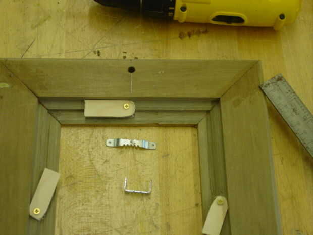 Hay muchos tipos de hardware de la suspensión que se puede comprar. Tengo 2 tipos en la foto. Pero prefiero un agujero de 1/4". Es más barato que la tienda compró hardware. Pero lo más importante es un agujero para colgar el marco poner al ras contra la pared.