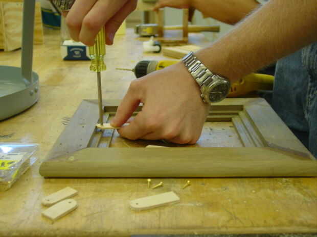 El primer hardware de encuadre que necesita son las pestañas para sujetar el cristal, imagen y respaldo en su lugar. Puedes comprar fichas en cualquier tienda de artesanía y hardware, pero prefiero hacer mi propia. Hice las fichas para este marco de madera y utilizar un tornillo de 3/8" al mantener en su lugar.