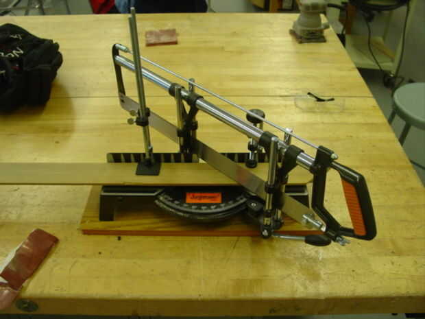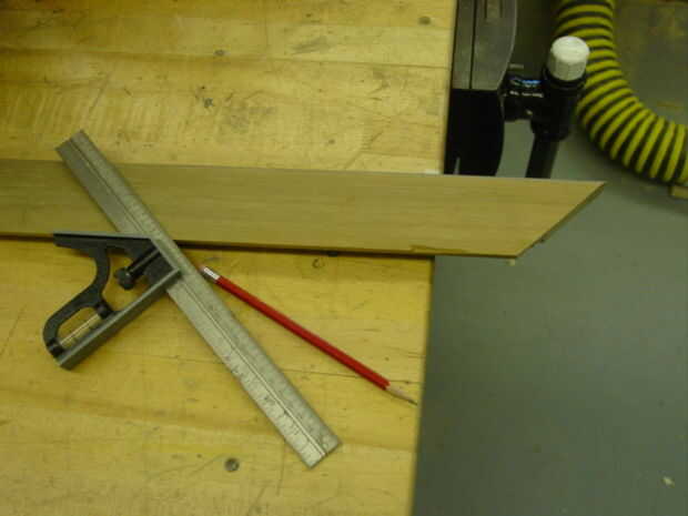 Después de cortar el final, entonces utilice una escuadra de combinación para medir y el diseño del marco. Medir en el interior de la estructura o el lado con la barbilla. Haga una marca en su medida y dibuje un 45 de esa marca.
