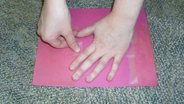 Cinta el otro extremo del Tul o cinta a la parte posterior del papel de scrapbook. Luego cortar el material sobrante.  Asegúrese de que esté lo suficientemente apretada como para apoyar los pendientes.  Repita hasta que el papel está cubierto con el material.