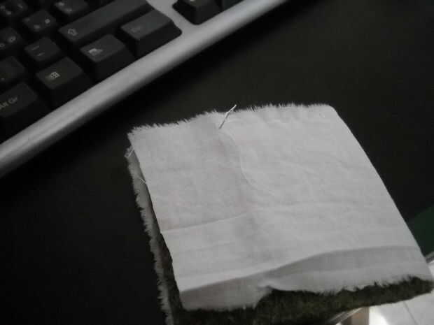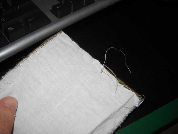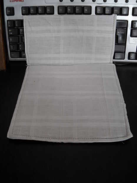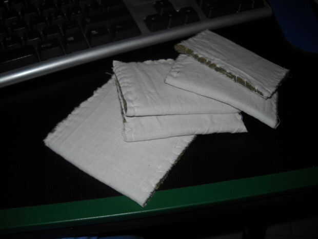 Si es necesario, lavar las piezas con jabón para la ropa y un cepillo duro, les escurra y deje secar. Plánchelos con almidón. Cubrir con tela blanca (o tela del color del algodón vamos a usar) y coser en los bordes.