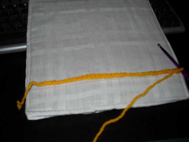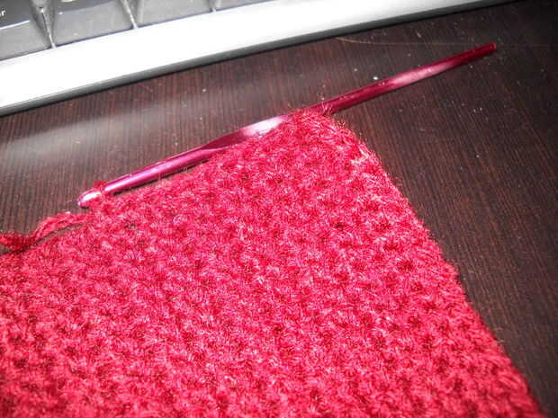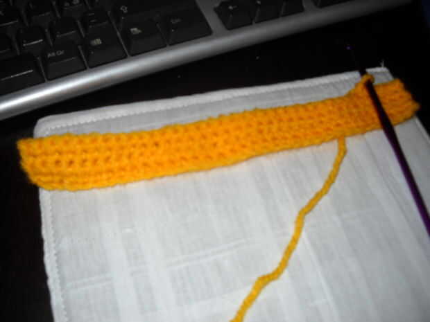 Cuando haya terminado de la base, no corte el hilo, pero ir en ganchillo en la frontera: cuando estás ganchillo en la parte lateral, que tienes que hacer un punto bajo cada fila. Para hacer el perímetro debe hacer 98 sc, porque en las esquinas se debe hacer 2 solo crochet en uno (inc sc). No corte el hilo.