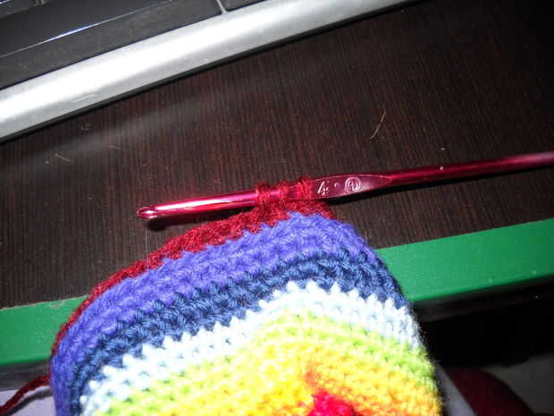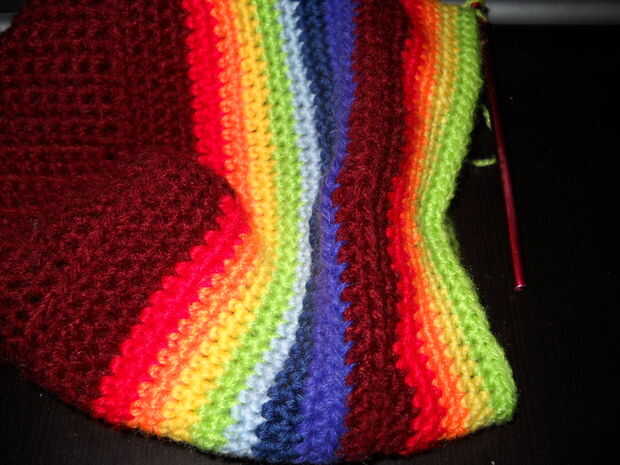 Crochet ahora sólo en el lazo posterior, a doblado la parte nueva. Hacer ganchillo solo decreciente en las esquinas (* 18 sc, 1 diciembre-sc ** 4 veces de * a **). Terminado esto en primer lugar, hacer otra ronda, con dec-sc en las esquinas (* 17 sc, 1 diciembre-sc ** 4 veces de * a **). Estas dos rondas deben ser de la misma medida que la profundidad de la alfombra. Si no, no otra ronda, o deshacer la última de ellas.