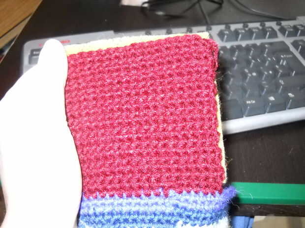 Sin cortar el hilo, go tejer otra plaza, 18 sc largo, adherida al tubo anterior. Debe empezar en una esquina y terminar en el otro. 23 filas de ganchillo.
