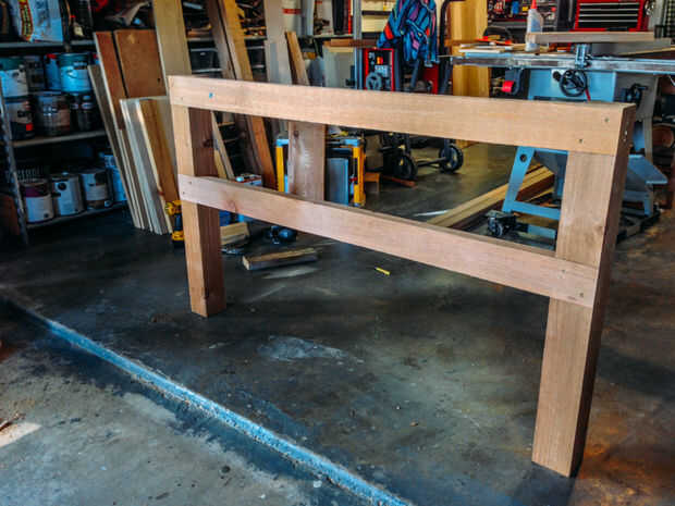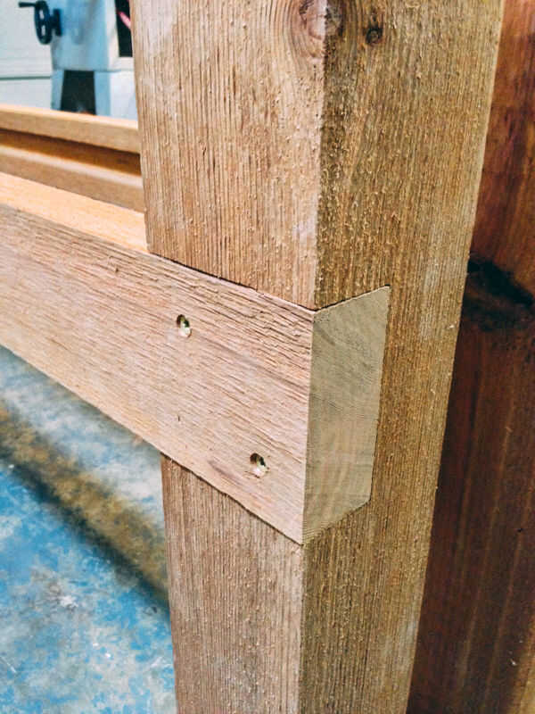 Empezaremos con las patas verticales principales. Dadoed a las secciones de las piezas laterales para adaptarse a. Lo hice con mi sierra de brazo radial y una pila de dado, pero usted puede incluso utilizar una sierra de mano y un cincel. Una vez que todo estaba cortado, he aplicado pegamento y apareció en las piezas laterales. Perforar agujeros piloto con una cubeta y me perforaron un par tornillos resistentes a la roya para mantener en las piezas a las mortajas. Realmente se puede ver que las piezas vertical están haciendo la mayor parte de la obra manteniendo el peso futuro.