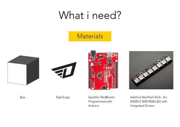 Comprar todo lo que necesitas: material plástico o de madera para la caja, crear logo, comprar Sparkfun RedBoard, Adafruit NeoPixel palo RGB LED, cables, cable (para conectar el tablero del arte con ordenador)