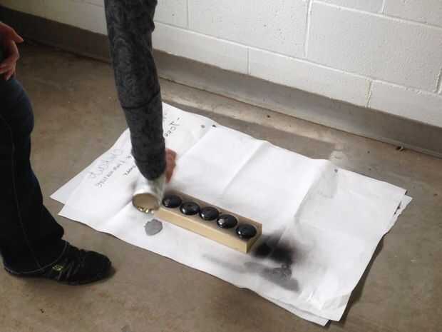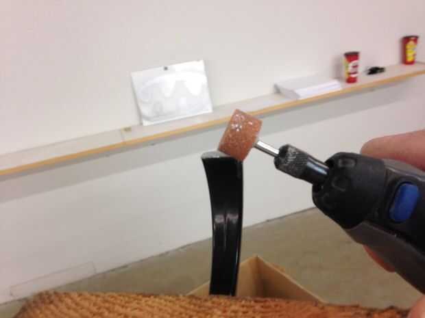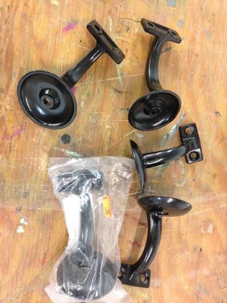 Compramos soportes de estantería negra y les hecho en perchas por cortar el disco superior y pulir los bordes filosos de. Entonces hemos repintado los negro.