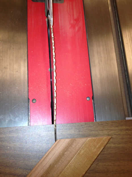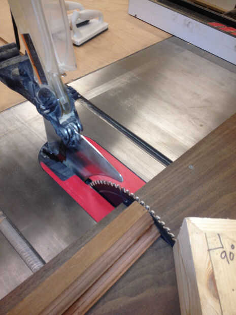 Inserte la llave de seguridad de la Sierra de mesa en el interruptor, posición detrás de la plantilla media pulgadas desde el contacto de la hoja, luego encender la sierra. esperar unos segundos con la sierra para que alcance la máxima velocidad y luego lentamente empuje la plantilla en la hoja de alimentación. Cuando el marco corte basura es gratis, respaldo de la plantilla y apagar la sierra. Tire la llave de seguridad y proceder al siguiente paso.