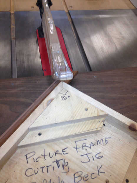 To usar la plantilla trabajar de derecha a izquierda. Con la Sierra y eliminar - Levante la hoja de sierra a aprox. 1/4" sobre el grueso de la moldura del marco. Entonces la primera esquina de la estructura a la izquierda de la separación cero del conjunto Sierra ranura de la cuchilla en la base de la plantilla. Luego apretar la pieza contra la guía lateral izquierda.