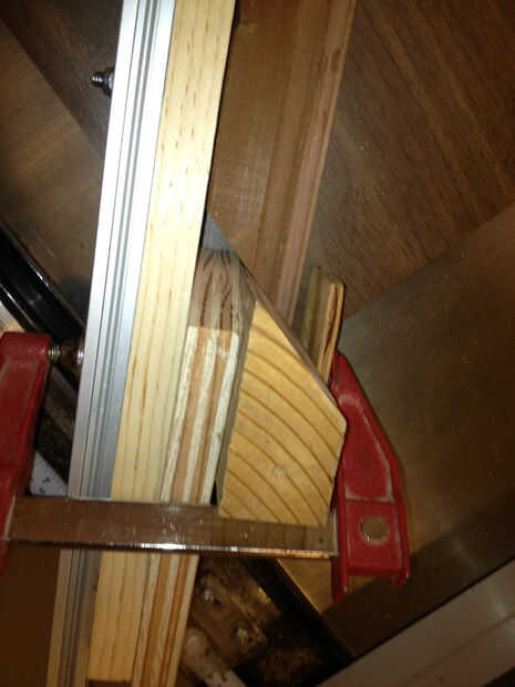 Con el pedazo de modelo que sólo ha cortado, colocar uno de los extremos a inglete contra la hoja de sierra, tire firmemente contra el tope-guía y fijarlo con la abrazadera. Ver foto 1 este paso.