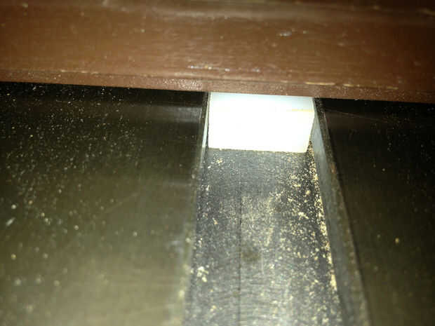 Para evitar que el tornillo de cabeza deslizante en el metal en la tabla VI ranuras avellanar la cabeza 1/16 de pulgada por debajo de la superficie de la UHMW. El 1" profundo agujero (tornillo) debe no irrumpirán en la superficie superior de la Junta. Foto 4, 5 que desee el UHMW que la mancha deslizante de la plantilla.