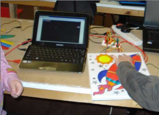 El niño será capaz de controlar una nave espacial (o sprite de su elección) manteniendo un clip de cocodrilo de la tierra en una mano y tocando los controles de conductores que se construyen en un cuadro de lienzo.