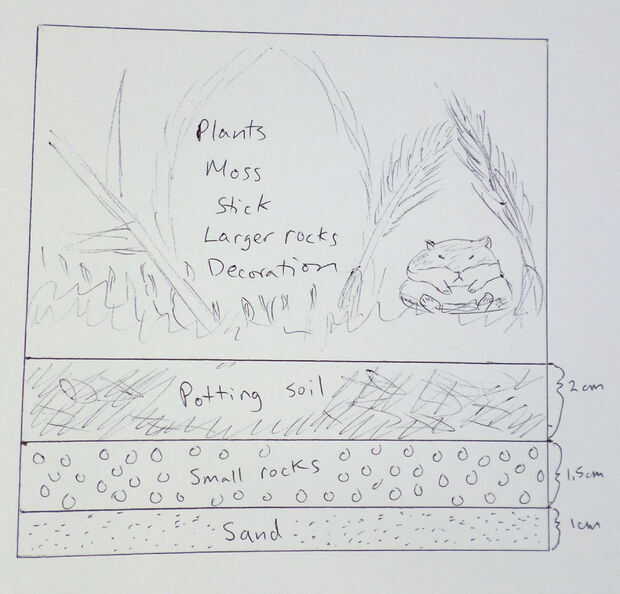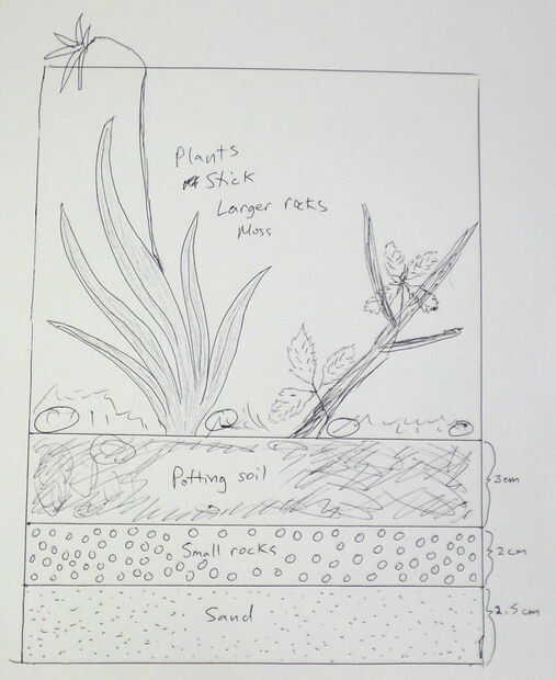 Puede planificar cómo desea su terrario para ver cuando se hace. En concreto, que se relleno con capas de arenas, pequeñas piedras y rellenado de suelo y luego arreglar las plantas, palos y otros adornos en la parte superior. Me pareció útil para planear el espacio dentro del marco de imagen ya que el espacio es limitado.