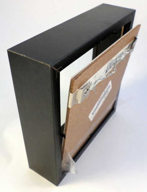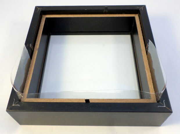 Debido al madera inserto en el marco negro de madera, no tengo espacio para pegar el vidrio a la estructura (pero tenido!). En su lugar usé alguna cinta de embalaje y había grabado a lo largo de la parte inferior del parte movible, deslizarse cómodamente en su lugar en el marco y selló el respaldo cerrado en él. Totalmente no sellarlo porque todavía necesitaba acceso interior, así que me todavía podría inclinar el respaldo hacia el exterior. Ver las fotos.