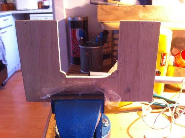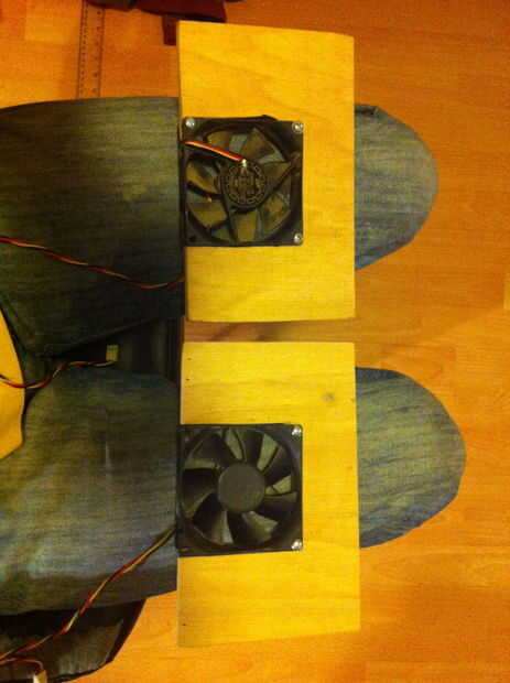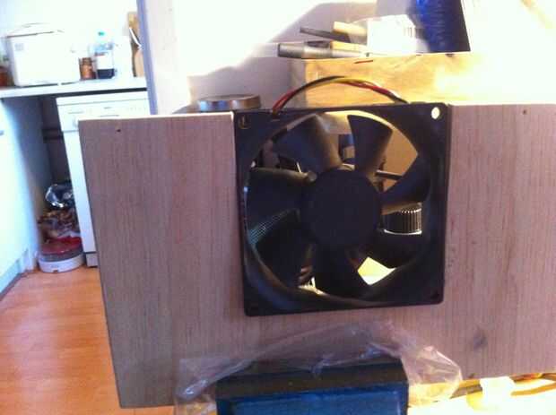 En los extremos más pequeños de la madera cortada, corte un agujero lo suficientemente grande para tu fan, mi agujero es una forma divertida como mi ventilador Tornillo varios agujeros ect, tuyo será probablemente diferente así que no he poner dimensiones.