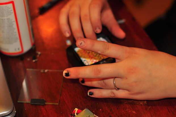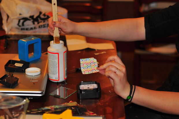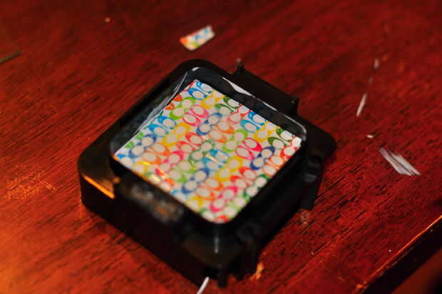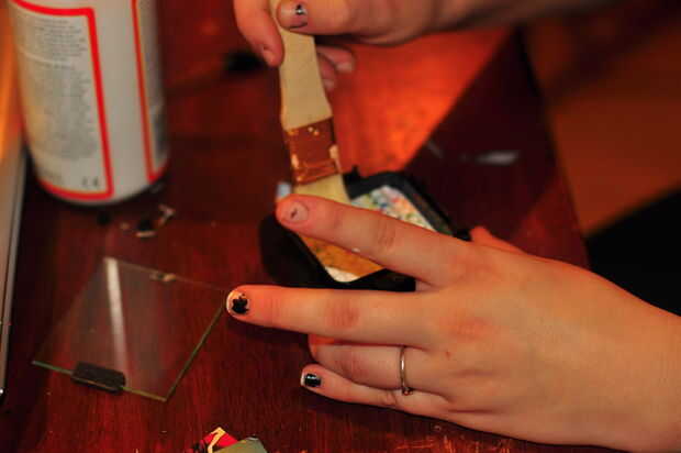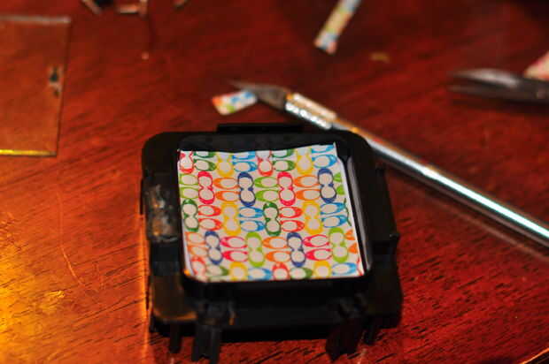 Ahora que han diezmado su reloj es el tiempo para que el cuadro! Cortar nuestra tu imagen y luego poner en el reloj si no cabe entonces mantener corte hasta que lo hace (lo que realmente ayuda es recortar hasta un ajuste cercano entonces poner en el marco y tomando su cuchillo del exacto y corte los bordes que no encajan, ayuda a conseguir un mejor ajuste). Después de tener tu foto el tamaño perfecto tomar tu mod podge (o palillo del pegamento) y pegar la imagen en. Qué después de colocar mi foto en voy sobre él con más mod podge para darle ese aspecto brillante, si haces esto lo deje reposar antes de hacer el siguiente paso.