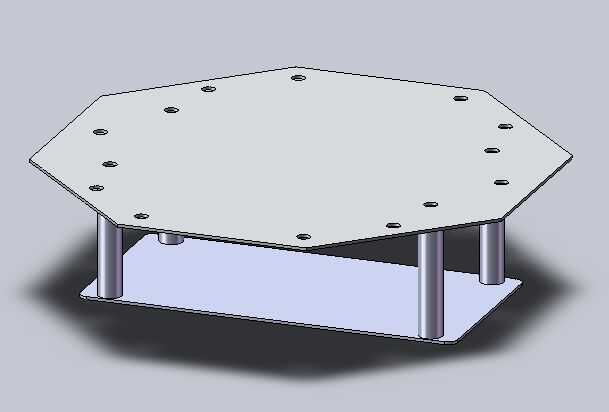 Coloque los 1.5" aluminio hexagonal espaciadores en (1.7,.86) y los puntos correspondientes entre el rectángulo de aluminio con la batería y el octágono con el protoboard. La batería debe estar bajo el protoboard. Perno el rectángulo, octogonal y hexagonales espaciadores usando plástico tornillos 4-40.