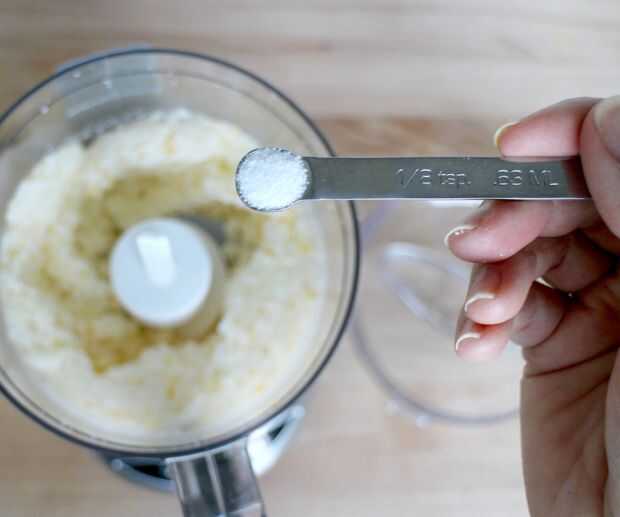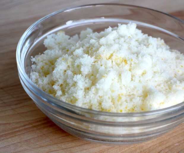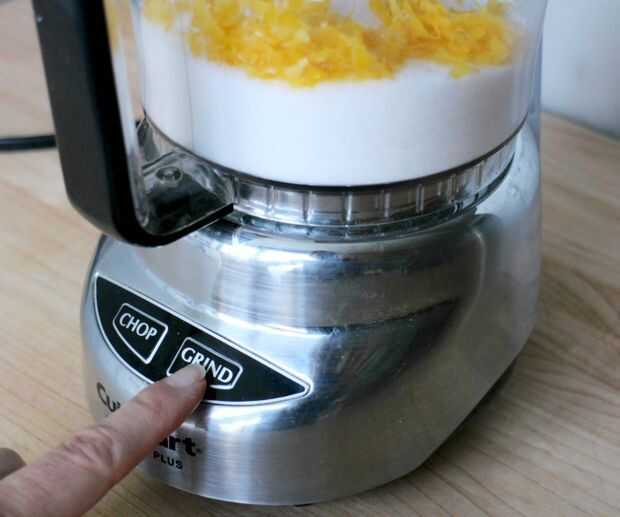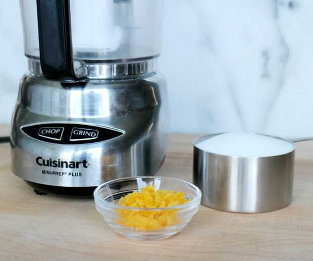 Añadir la ralladura, el azúcar y la sal a un pequeño procesador de alimentos y muela hasta que la cáscara es fina y bien mezclada con los otros dos ingredientes.