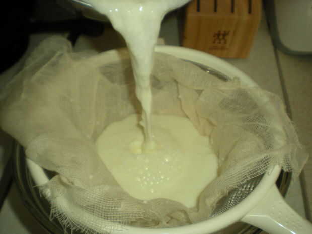 • Vierta la leche a través de la tela de queso captura la cuajada del queso.
