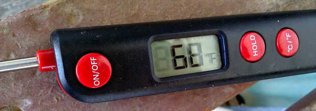 Después de 9,5 minutos de cocción, el perro caliente fue a una temperatura interna de 158 grados F.