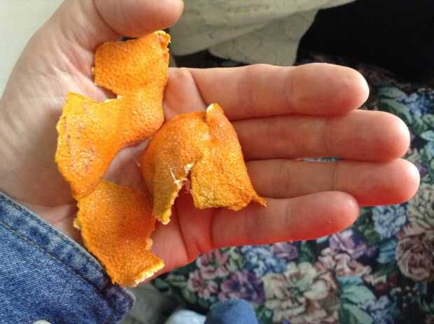 Un poco menos de una porción del tamaño de la palma de cáscara de Clementina y naranja, o... simplemente se advierte que algunas cáscaras son amargos. Lavar la fruta antes de peeling, el peeling puede ser secado y utilizado más adelante