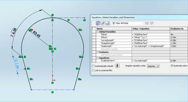 Usted notará en las ecuaciones también seguimiento de la curva longitud del boceto original y la longitud total (incluyendo las patas de la venda). Yo uso estas para acotar correctamente un nuevo bosquejo para el molde utilizando el radio del springback. El arco circular con el radio del springback tiene la misma longitud que la curva de la forma original, y las patas tienen la misma longitud.