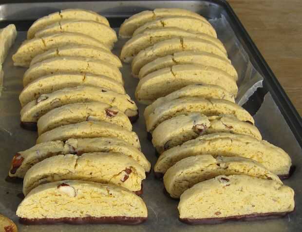 Derretir el chocolate a baño María. Sumergir la parte inferior de cada biscotti en el chocolate y en una hoja de pergamino forrado enfriar.