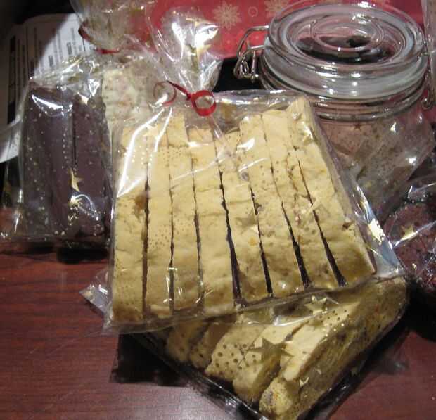 Envuelva una media docena o tan bolsa de bizcochos en un celofán y etiqueta para que el destinatario sepa disfrutar de ellos con una bebida caliente.