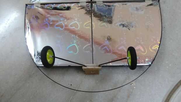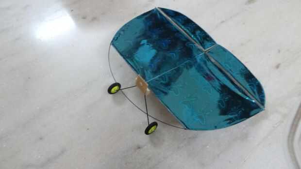 Hacer una forma de V con fina varilla de metal con los bordes doblados un poco. Deslizamiento en las ruedas y bloquea el borde con el balanceo de una pieza delgada de cinta adhesiva. De esta manera las ruedas no saltará mientras se está ejecutando. Pegue el engranaje al marco con pegamento.