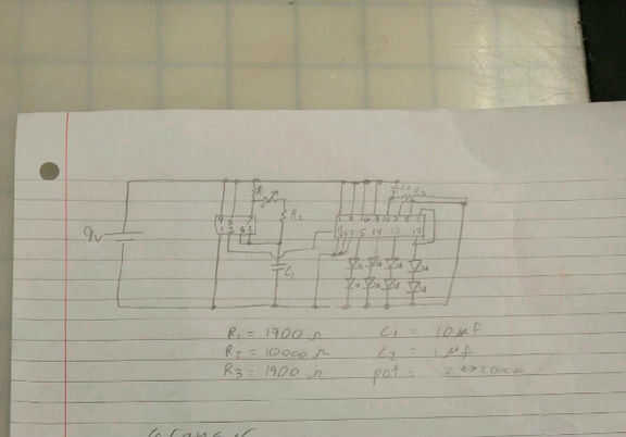 se iniciará después de la recopilación de todos los suministros y diseñar el circuito de qué tan rápido quieres que flash cada fotograma. que le conectes tu circuito como el que yo esbozo en papel en los cuadros. Cuando todo lo montan Asegúrese de que utilice un color para las conexiones de positivo, un color diferente para las conexiones negativas y un color diferente para las conexiones de pin a pin. No hago esto y me cuesta mucho tiempo y agonía durante el proceso de solución de problemas. No te preocupes de conectar el circuito Astable pero necesitamos primero asegúrese de que el LED se secuencia correctamente, que podemos añadir el circuito Astable que permite que cuando se apaga la luz.