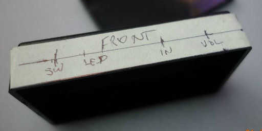 Pegar pegatinas de blanco en blanco en las superficies que van a montar los conectores y los controles. En mi caso decidí tener un delantero y trasero - como un amplificador de tamaño completo. Marcado donde cada control sería (véase los cuadros).