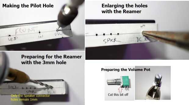 Finalmente, agrandar los orificios con el exprimidor siguiendo las pautas de la sección anterior. No se agranda el agujero de la LED de 3mm a menos que usted está usando un LED de tamaño más grande.