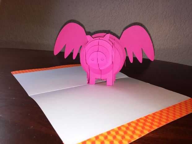Un par de años atrás, descubrí a pop-up tarjetas y sliceforms. He estado haciendo algunos desde entonces, pero este es mi primer sliceform que recurro en un pop-up tarjeta. Vine con la idea de un cerdo con alas un par de semanas atrás cuando estaba pensando en cosas imposibles.